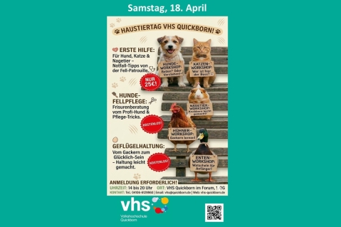 Das Team der VHS Quickborn lädt alle Interessierten ein zum ersten großen Haustiertag am Samstag, 18. April, 14 bis 20 Uhr in der VHS im Forum, Bahnhofstr. 112, Eingang direkt vom Bahnsteig. Geboten werden verschiedene, interessante Angebote: 14 - 15 Uhr, kostenloser Workshop: Hunde-Fellpflege leicht gemacht - Tipps vom Profi Katja...
