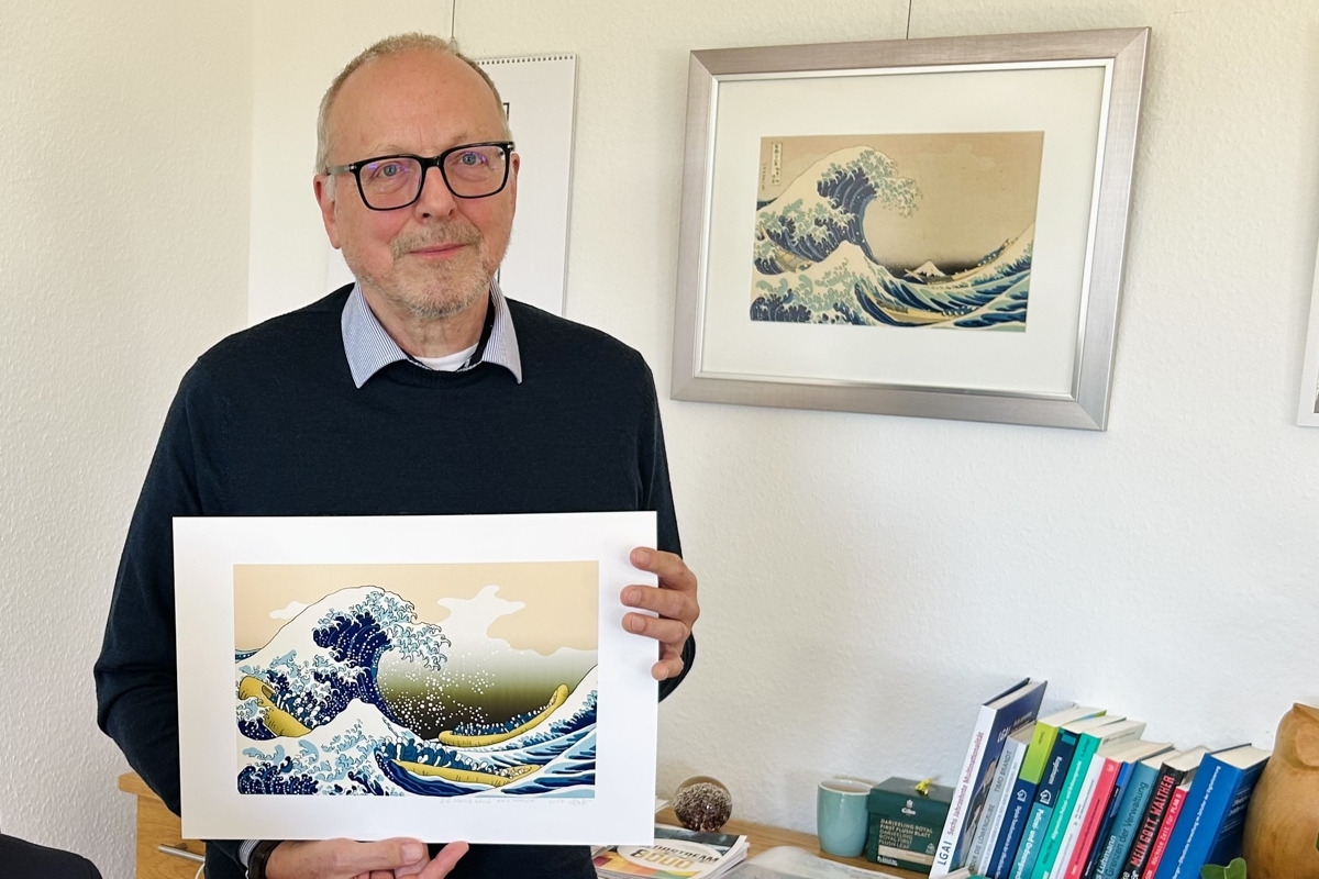 Als Gastgeschenk überreichte Edwin Zaft Bürgermeister Beckmann eine digitale Reproduktion der „Großen Welle“ von Katsushika Hokusai, die er 2017 auf seinem Tablet selbst angefertigt hat – ohne den Einsatz von KI. In seiner Version hat Zaft die traditionellen Fischerboote durch Flüchtlingsboote ersetzt, eine Arbeit, die zum Nachdenken über Bilder, ihre Bedeutungen und ihre Aktualität anregt.