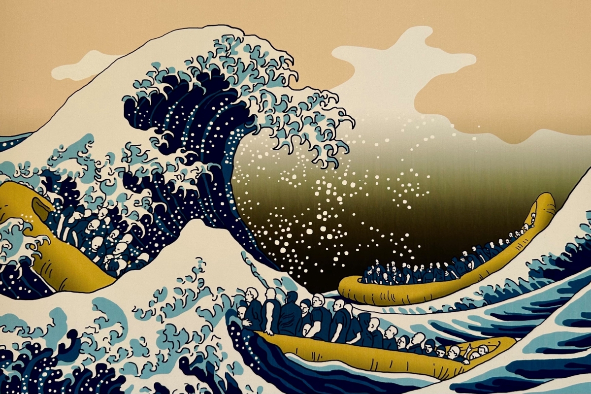 In seiner Version der „Großen Welle“ hat Edwin Zaft die traditionellen Fischerboote durch Flüchtlingsboote ersetzt