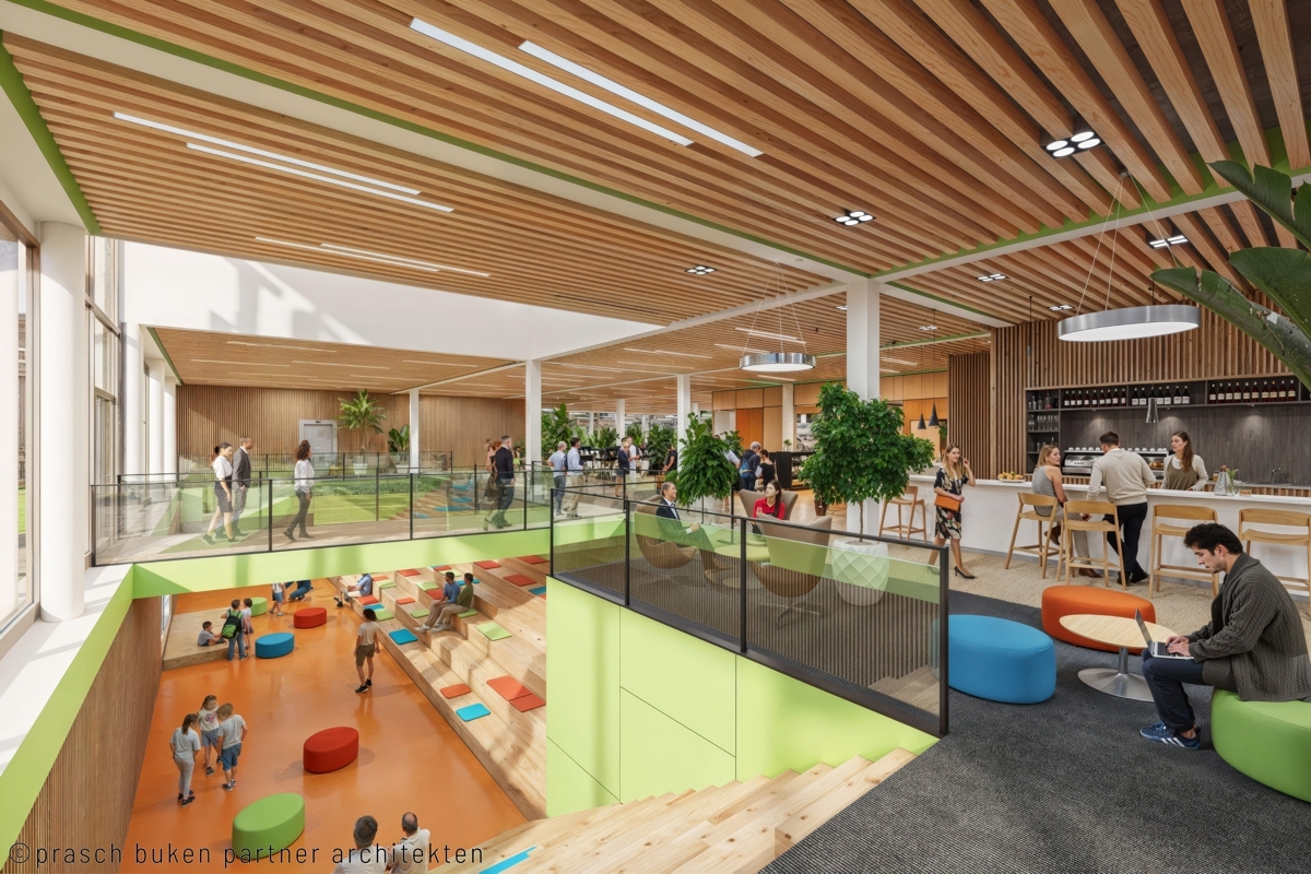 An dieser Stelle setzt das Konzept des Dritten Ortes TO HUUS an: Im Erdgeschoss des geplanten Neubaus in der Bahnhofstraße 60 bis 68 soll ein außergewöhnlich gestalteter Raum entstehen, der Offenheit, Zugänglichkeit und multifunktionale Nutzungsmöglichkeiten auf eindrucksvolle Weise verbindet. Der architektonische Entwurf des renommierten Hamburger Büros „prasch buken partner architekten“ setzt dabei auf eine innovative Raumkomposition: Der öffentlich zugängliche Bereich öffnet sich sowohl nach unten als auch nach oben. Die vier Meter hohe Decke wird durch ein großflächiges Oberlicht durchbrochen, das den Innenraum mit natürlichem Tageslicht flutet – ein zentrales Gestaltungselement, das Transparenz und Atmosphäre schafft.